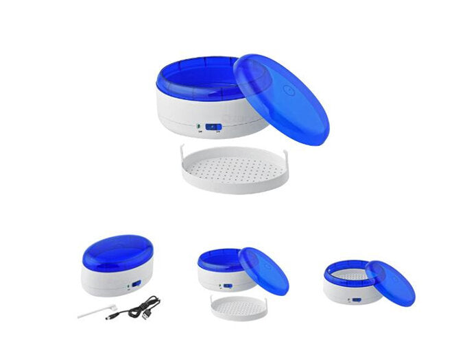 The operation is very easy, you just need fill-in it with plain water, submerge the item to be cleaned, then press "ON" button. Stainless steel tank. A good helper for cleaning life. Item is powered by 4 x AA batteries(not included) or USB.